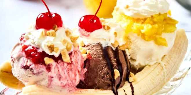 A fresh banana, three scoops of vanilla, chocolate, and strawberry ice cream, pineapple, chocolate syrup, and strawberries are the ingredients of the traditional ice cream treat known as a banana split. Not to mention the maraschino cherries, almonds, and whipped cream. Take a spoon and start eating! Are you ready …